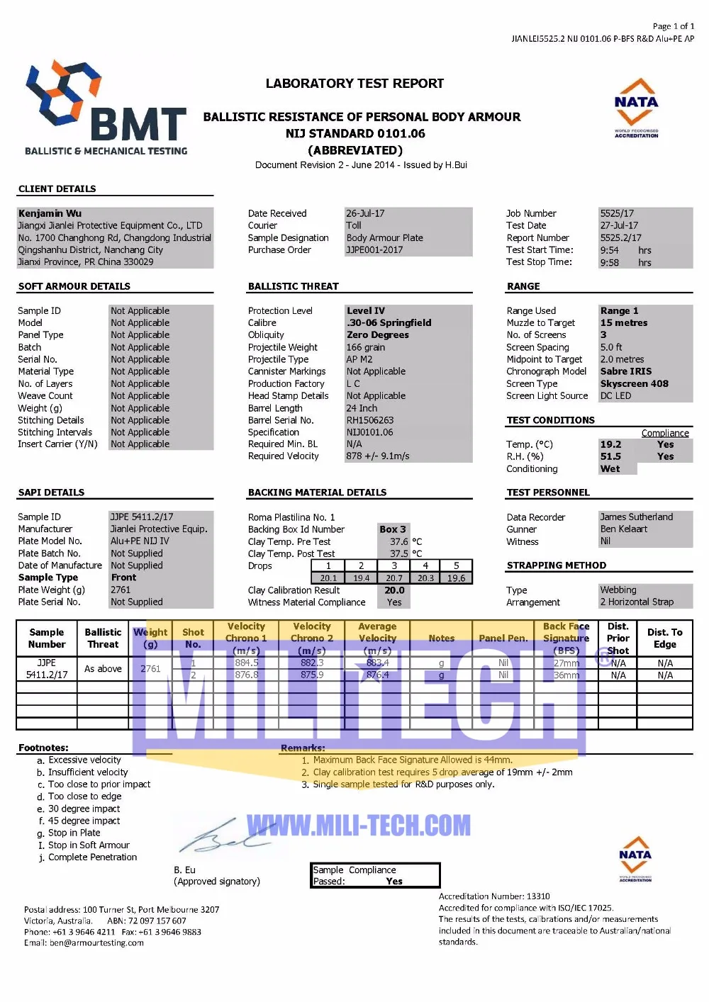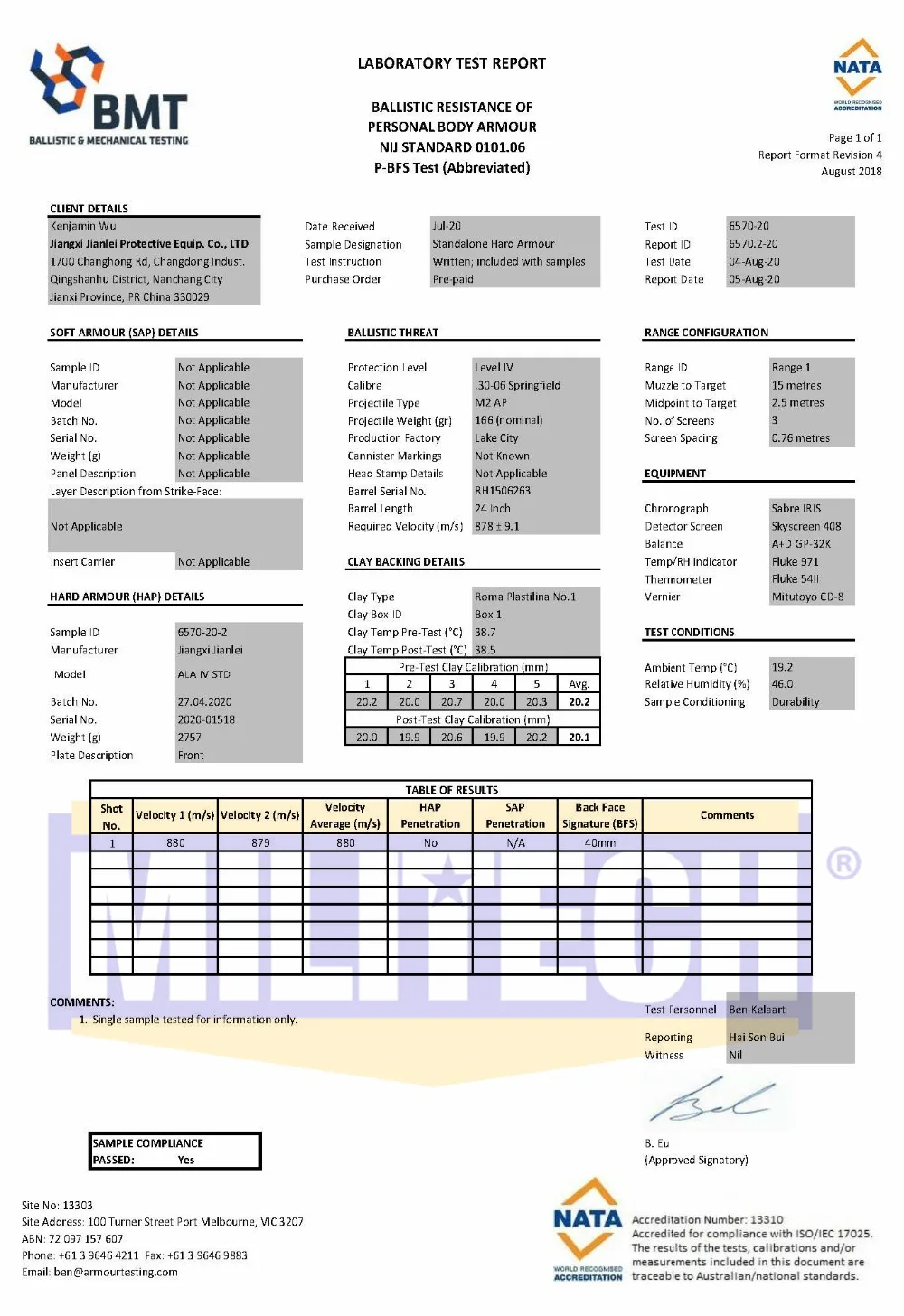We did the latest test to our NIJ IV Alumina Ceramic&PE Panel in August 2020, Below is the test report from BMT of Australia: